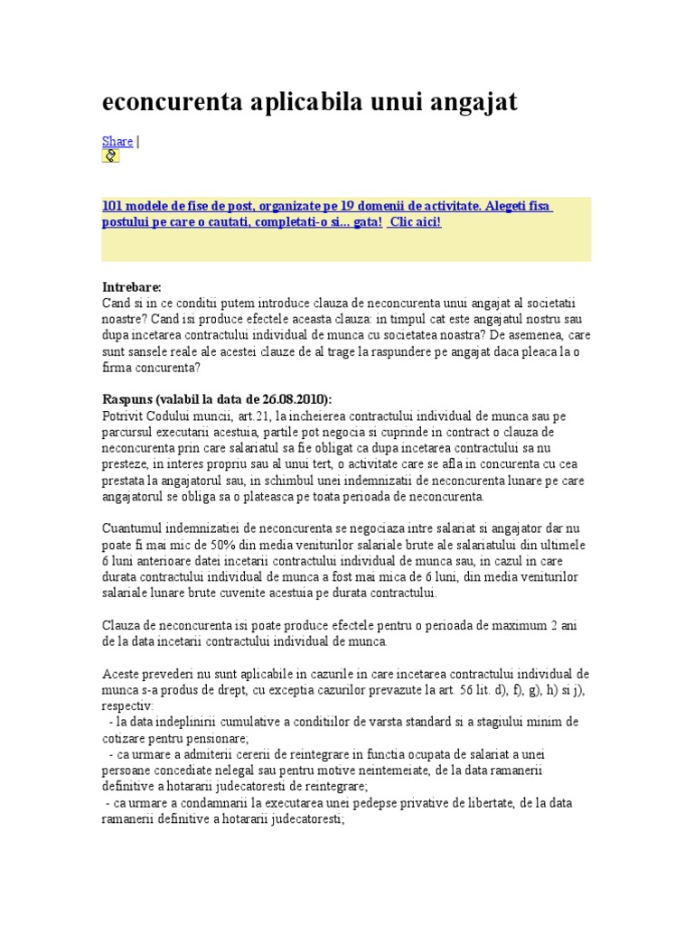 Doc Clauza De Neconcurenta Clauza Specifica Prevazuta De Codul Muncii Cezar Cojocariu Academia Edu