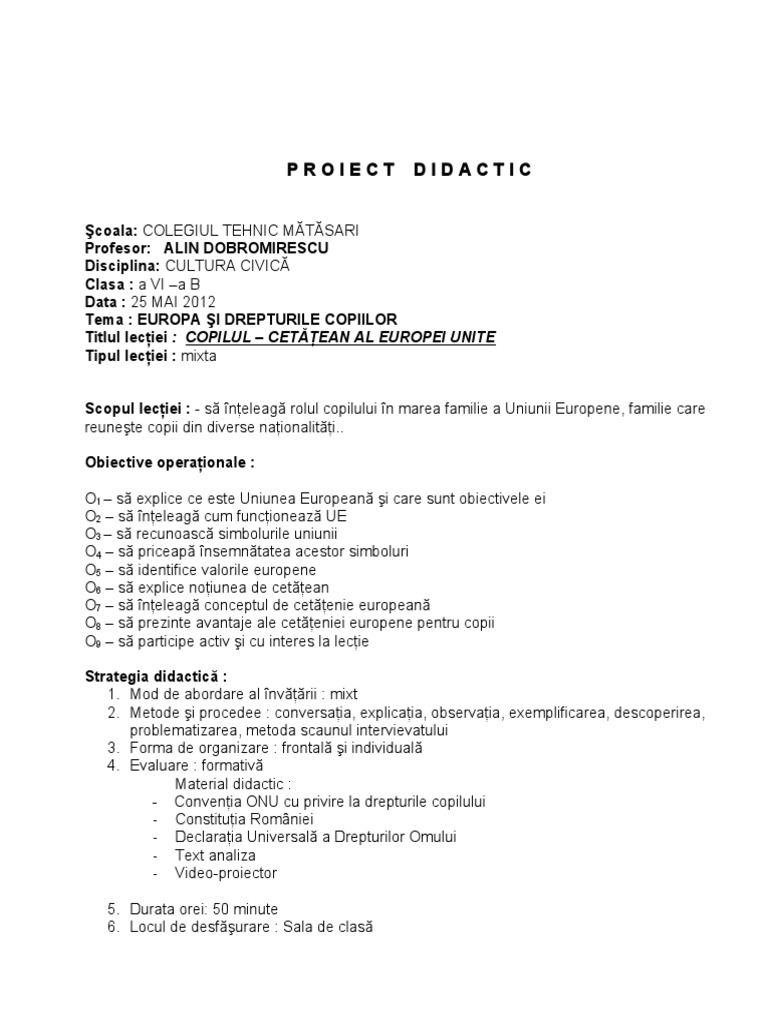 Doc Proiect De Lectie Clasa A Iv A Educatie Civica Drepturile Copilului Vazute Prin Ochi De Copil Logan Rugina Academia Edu