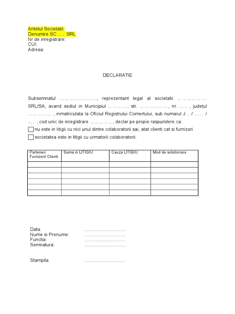 Model Declaratie Litigii