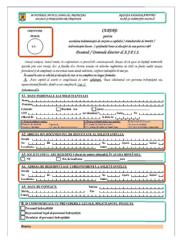 Cerere Pentru Acordarea Indemnizatiei De Crestere A Copilului Stimulentului De Insertie Indemnizatiei Lunare Sprijinul Lunar Si Alocatiei De Stat Pentru Copii Rotarexim S A
